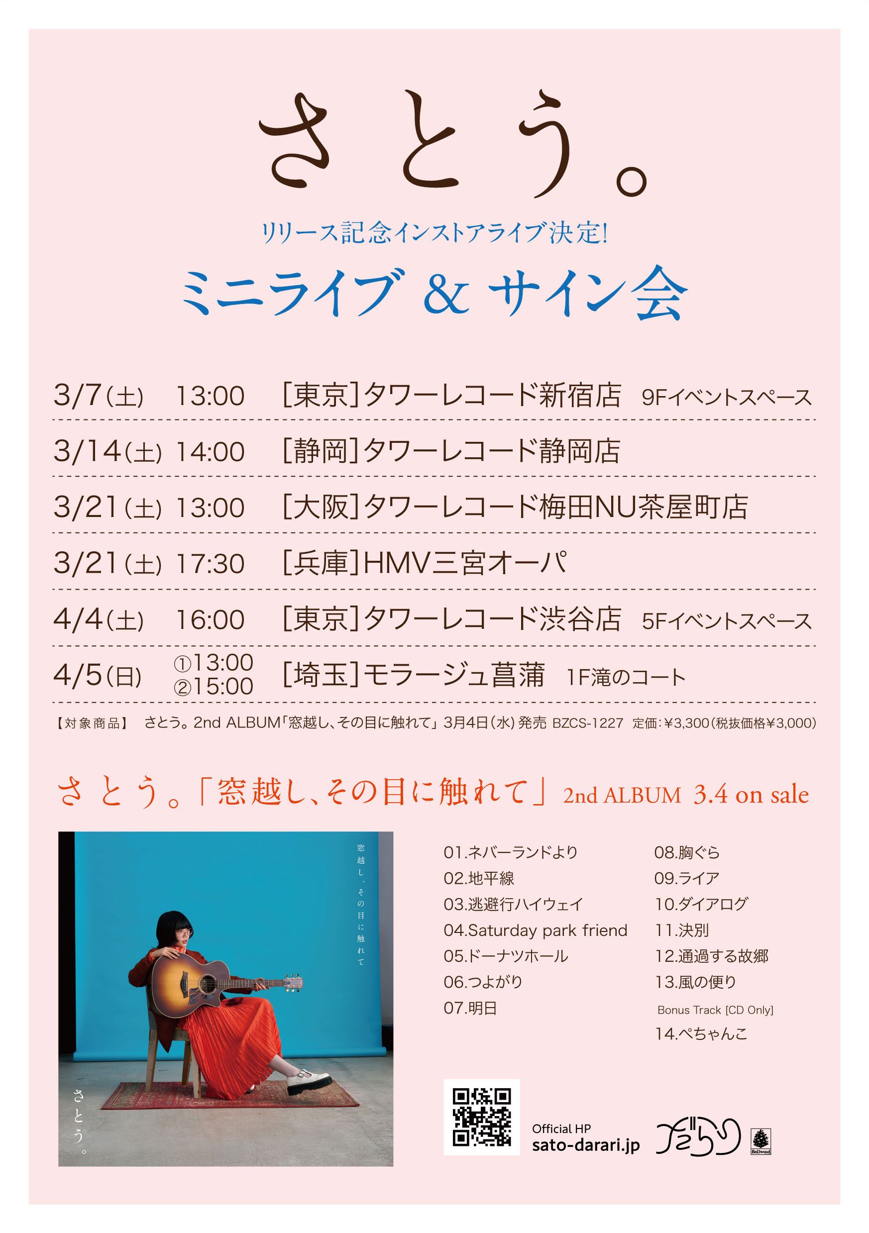 2026年3月4日発売、さとう。2nd ALBUM「窓越し、その目に触れて」の発売を記念して、インストアライブが決定いたしました。対象商品をご購入いただいた方にはサイン会も実施いたします。是非、ご来場ください!
