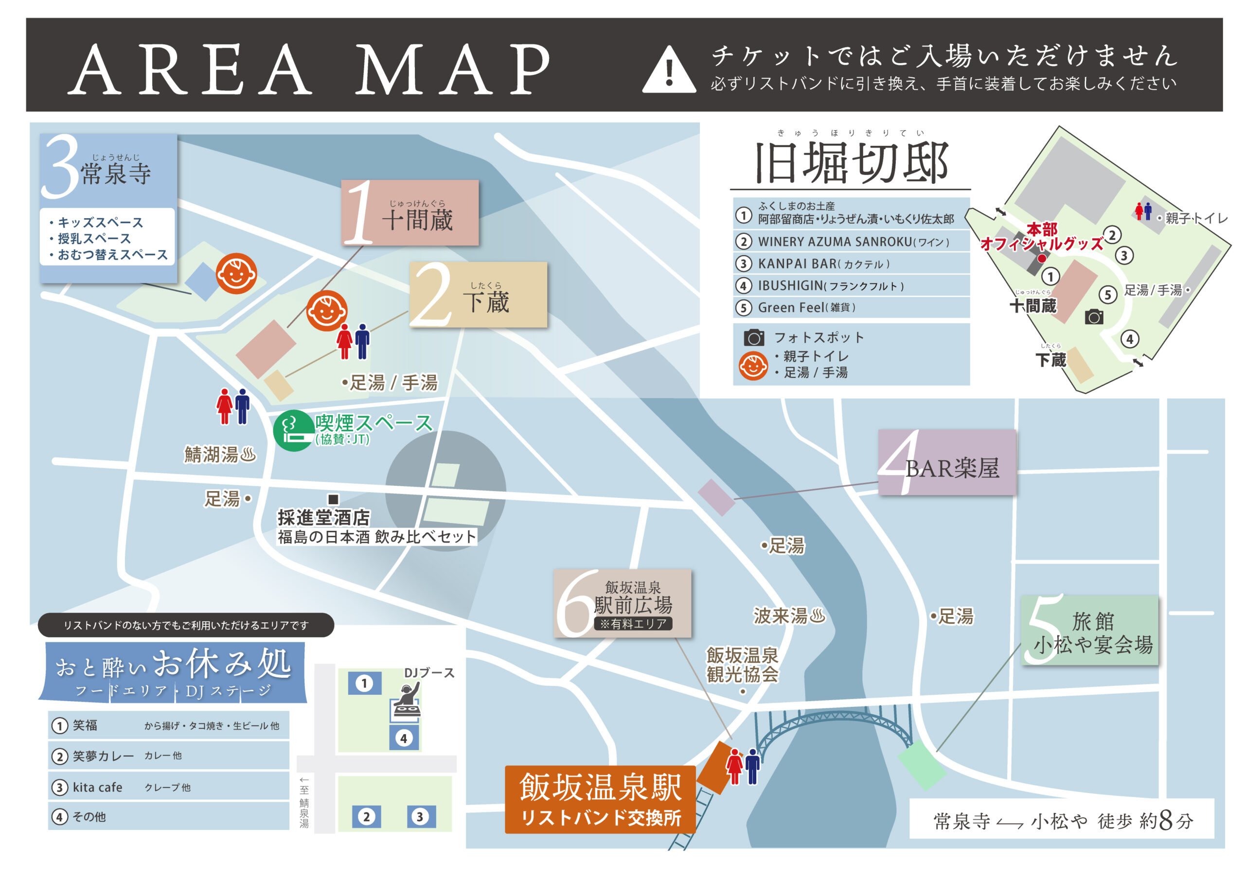 (旧堀切邸 十間蔵 、下蔵、常泉寺 本堂、BAR 楽屋、小松や宴会場、飯坂温泉駅前広場※有料エリア)